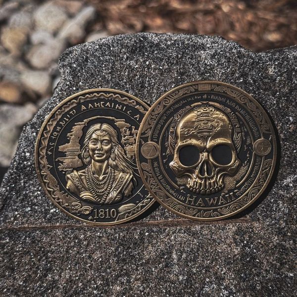 Beyond the royal history, this coin delves into the shadows of island folklore with the design of the "Lost Tally." The skull depicted on the coin is not merely a symbol of mortality, but a reference to a legendary token said to be carried by the King’s secret network of warriors and rebels. According to the lore we’ve woven into this design, these skull-marked tallies were left behind at sacred grounds and ancient battle sites—a silent signal that the resistance was watching, and that the spirit of the sovereignty lived on in the shadows.